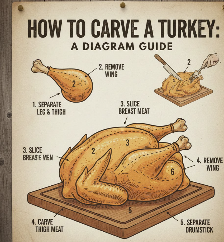 A turkey carving diagram shows bone structure, joints, and muscle sections. This improves carving accuracy.