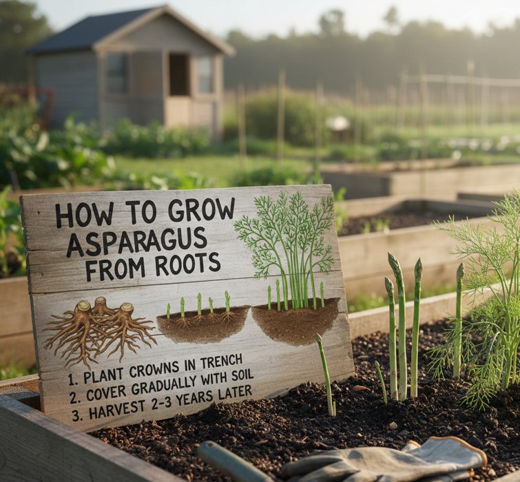 Growing asparagus from roots is similar to crowns but focuses on root health preservation.