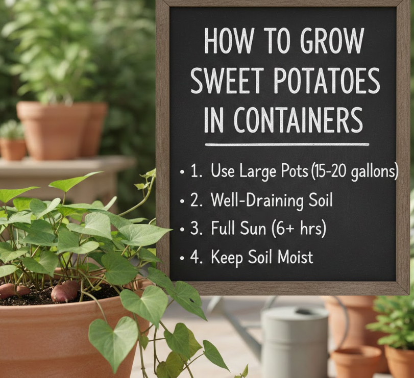 Sweet potatoes need 6–8 hours of direct sunlight daily. Containers make it easy to reposition plants for maximum sun exposure.