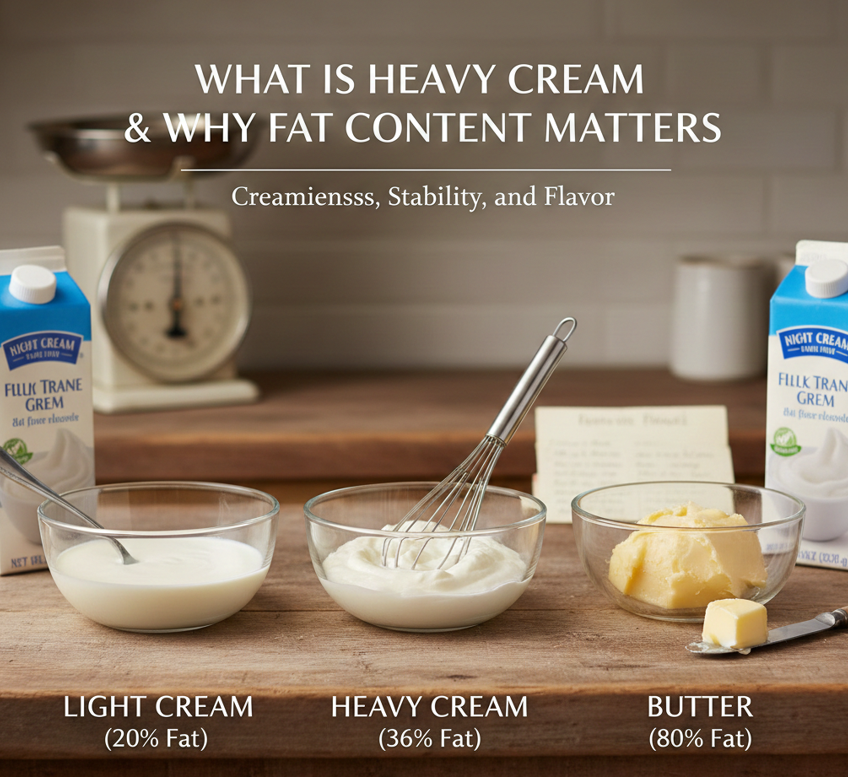 Heavy cream is the high-fat portion of milk that rises to the top before homogenization. Its fat content is what gives dishes richness, thickness, and stability.