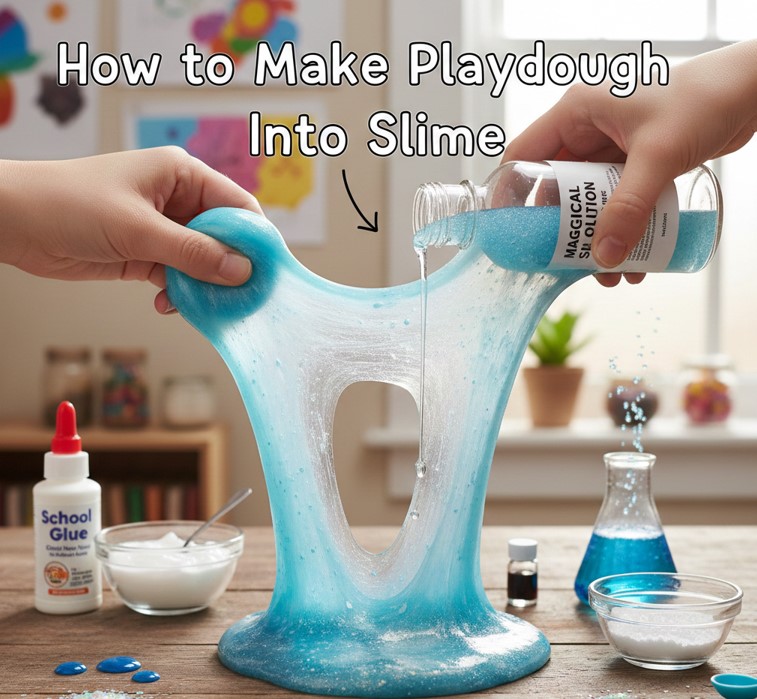 Transforming dough into slime teaches texture science. Learning how to make playdough into slime introduces polymer concepts safely.