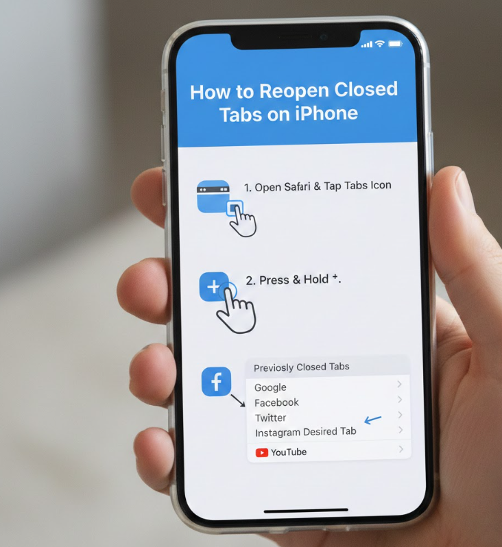 Open Safari, tap the tabs icon, then press and hold the “+” button. A list of recently closed tabs appears instantly. This feature is built directly into iOS Safari and is extremely convenient.