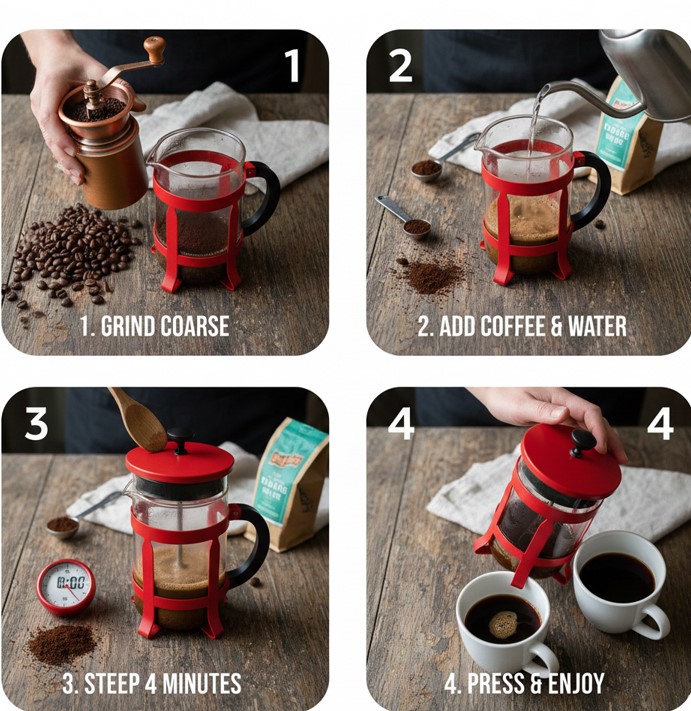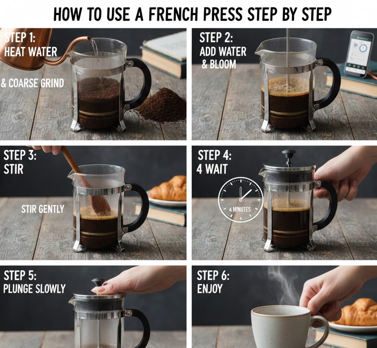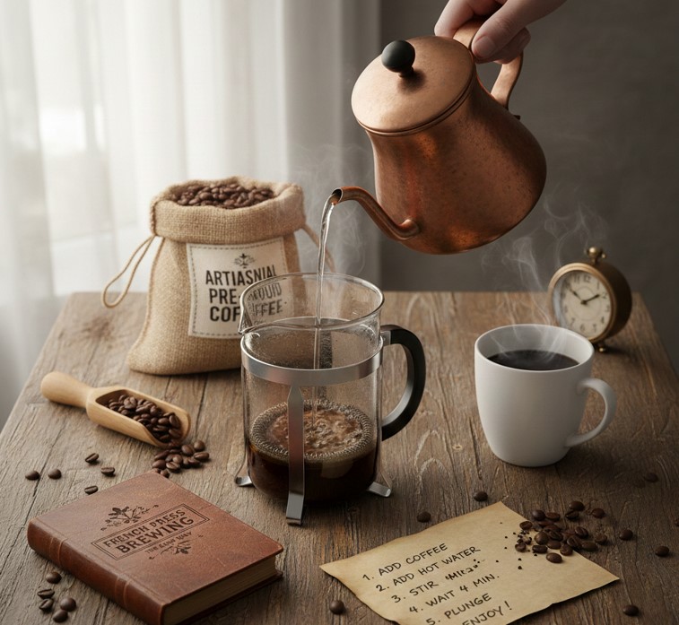 This method explains how to use a French press properly, ensuring optimal extraction and balanced flavor. The key lies in grind size, water temperature, and timing.