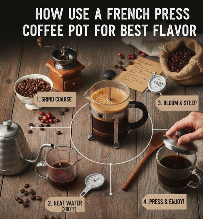 In this comprehensive guide, you’ll learn how to use a French press coffee maker properly, including step-by-step instructions, charts, common mistakes, and specialized methods for pre-ground coffee, cold brew, tea, and Bodum French presses.