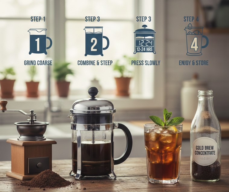 Cold brew requires long immersion, making the French press ideal for smooth, low-acid coffee.
